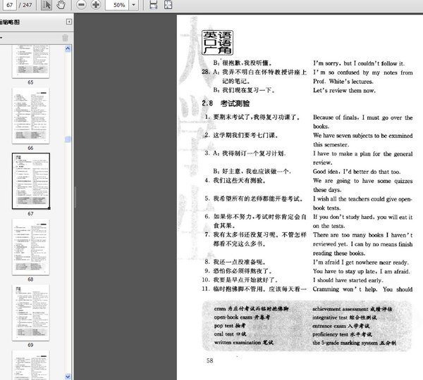 范佳程总主编的《大学生英语口语广角》涵盖了大学校园生活中英语口语的方方面面,是大学生英语口语的百科全书。《大学生英语口语广角》根据所涉及的口语情景分成不同的模块,每个模块分成3个部分,即时尚、经典对话,相关词汇和短语,热点话题深入探讨等。话题时尚实用,对话规范地道,热点话题可作为大学生练习口语的谈资储备。