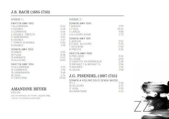 : CD1 01. Partita, BWV 1002: I. Allemanda 02. Partita, BWV 1002: II. Double 03. Partita, BWV 1002: III. Corrente 04. Partita, BWV 1002: IV. Double, Presto 05. Partita, BWV 1002: V. Sarabande 06. Partita, BWV 1002: VI. Double 07. Partita, BWV 1002: VII. Tempo di borea 08. Partita, BWV 1002: VIII. Double 09. Sonata BWV 1003: I. Grave 10. Sonata BWV 1003: II. Fuga 11. Sonata BWV 1003: III. Andante 12. Sonata BWV 1003: IV. Allegro 13. Partita, BWV 1004: I. Allemanda 14. Partita, BWV 1004: II. Corrente 15. Partita, BWV 1004: III. Sarabanda 16. Partita, BWV 1004: IV. Giga 17. Partita, BWV 1004: V. Ciaccona CD2 01. Sonata BWV 1005: I. Adagio 02. Sonata BWV 1005: II. Fuga 03. Sonata BWV 1005: III. Largo 04. Sonata BWV 1005: IV. Allegro assai 05. Sonata BWV 1001: I. Adagio 06. Sonata BWV 1001: II. Fuga, Allegro 07. Sonata BWV 1001: III. Siciliana 08. Sonata BWV 1001: IV. Presto 09. Partita, BWV 1006: I. Preludio 10. Partita, BWV 1006: II. Loure 11. Partita, BWV 1006: III. Gavotte en rondeaux 12. Partita, BWV 1006: IV. Menuet I – Menuet II 13. Partita, BWV 1006: V. Bourée 14. Partita, BWV 1006: VI. Gigue 15. Sonata a violino solo senza basso: I. 16. Sonata a violino solo senza basso: II. Allegro 17. Sonata a violino solo senza basso: III. Giga 18. Sonata a violino solo senza basso: IV. Variatione