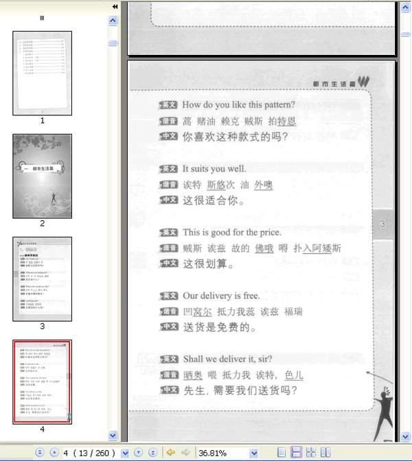 : 一、都市生活篇 1.在商店 2.在超市 3.在邮局 4.在银行 5.在医院 6.在餐馆 7.在美发店 8.在干洗店 二、旅行必备篇 1.护照/签证/通关 2.在机场/乘飞机 3.宾馆住宿 4.交通出行 乘火车 乘出租车 5.旅游观光 6.遇到不便 语言不通 迷路 生急病 丢失物品 三、市民必会篇 1.寒暄问候 2.介绍 3.告别 四、日常话题篇 1.谈论天气 2.谈论时间与日期 3.谈论兴趣与爱好 4.谈论家庭 5.谈论工作 五、电话沟通篇 六、商务实战篇 七、运动休闲篇 八、常用标志篇 九、奥运术语篇 十、常用单词篇 1.表示数字 2.表示时间、日期 3.表示季节、月份 4.表示颜色 5.表示动物 6.表示水果 7.表示称谓