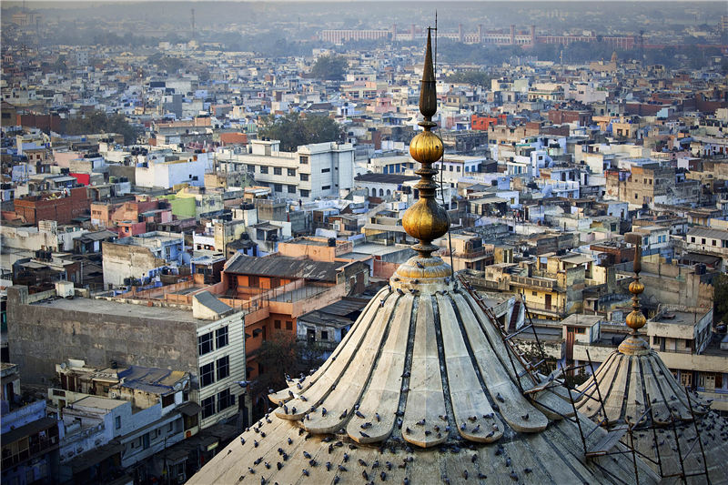 从贾玛清真寺顶部鸟瞰德里老城市景