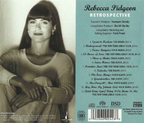 Standing at the crossroads of Scottish Folk and Modern Pop, singer/songwriter Rebecca Pidgeon has recorded three wonderfully imaginative albums with Chesky Records over the last decade. In each of Rebecca's distinct recordings she demonstrates an uncanny ability to span a wide range of vocal and song styles, while consistently propelling her signature sweet voice. Now commemorating the best from each album, this collection offers you the individual titles that together create an exciting mosaic of this amazing singer/songwriter. Enjoy Retrospective with the outstanding sound quality of SACD format.