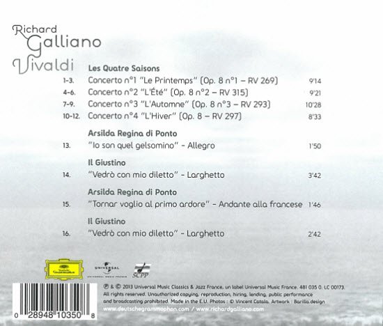 韦瓦第的《四季》小提琴协奏曲应该是巴洛克时期最具代表性的作品。韦瓦第以乐声绘成谱上所写的十四行诗画面,活泼令人振奋的节奏,令人聆赏时很容易随乐声行进产生一种对季节岁月的情景构图。再加上典雅工整的巴洛克风格,在在使它成为古典曲目数一数二的受欢迎作品。理查.盖利安诺在这里把它改编成手风琴加上弦乐五重奏的编制,清新的面貌让人耳目一新,也证明韦瓦第的音乐没有国界,更不受时空的约束。