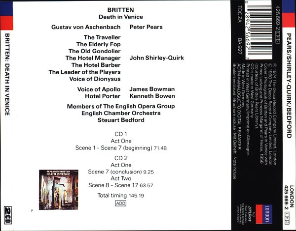此版本为贝德福德指挥英国室内乐团版(Pears, Shirley-Quirk,Bowman演唱),《企鹅》评介三星。 由于作曲家在该剧首演前心脏病发作, 首演的排练就是Bedford负责的。 Pears自然清楚他终生的伴侣最后一部作品完全是为他而作,因此他的演出既是对布里顿一生的总结, 也是自己真实心理的告白。仅此一角就可以使Pears不朽。