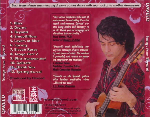 Daveed 的音乐风格很独特,融合了热情的西班牙吉他与诱人的 R&B、Hip Hop 嘻哈节奏交织在一起的旋律和节奏,迷人的沉思小夜曲将直接与你的灵魂对话,沁人心脾。   Daveed 成功地掌握了吉他的语言,艺术家利用多种工具创造了一首首和谐完美的诗篇,几乎催眠的声音。这位天才音乐家通过自己的努力在洛杉矶逐步建立起他的录音室。如今他已经出版了四张唱片:《Dreams》、《Don't Be Sad》、《The Healing Garden》和《Songs From Beyond 超越之歌》。现在,Daveed 的声音在许多国家受到欢迎。音乐被世界各地的各种电视和无线电台收藏,包括“The Weather Channel”、“CBS”和“ABC”等。此外,还被200多个 Yoga、Pilates、Meditation、Healing、Tai Chi 等健身影碟收录,在商业上达到了一定的高度。   《Songs from Beyond》是他在 Infinite Mind/DAS 厂牌下发表的最新作品,也是他个人的第四张专辑。风格介乎于 Flamenco、Hip-Hop、New Age 之间。神奇之旅由光滑如丝的西班牙吉他、萨克斯风和小提琴缓缓拉开,微妙平衡出的东西方音乐让爱萦绕在心头,充满了能量,超越了时间与空间。(以上拾心人原创,转载请注明作者和出处——See2say.com 看道)