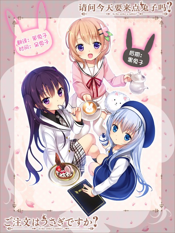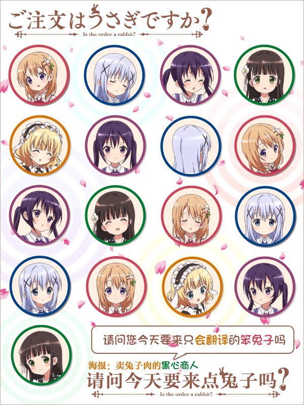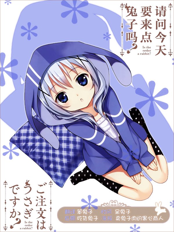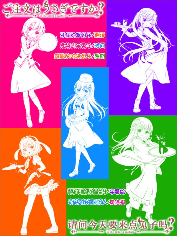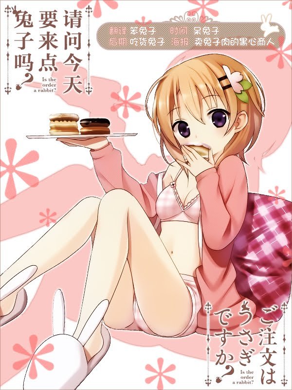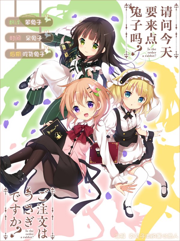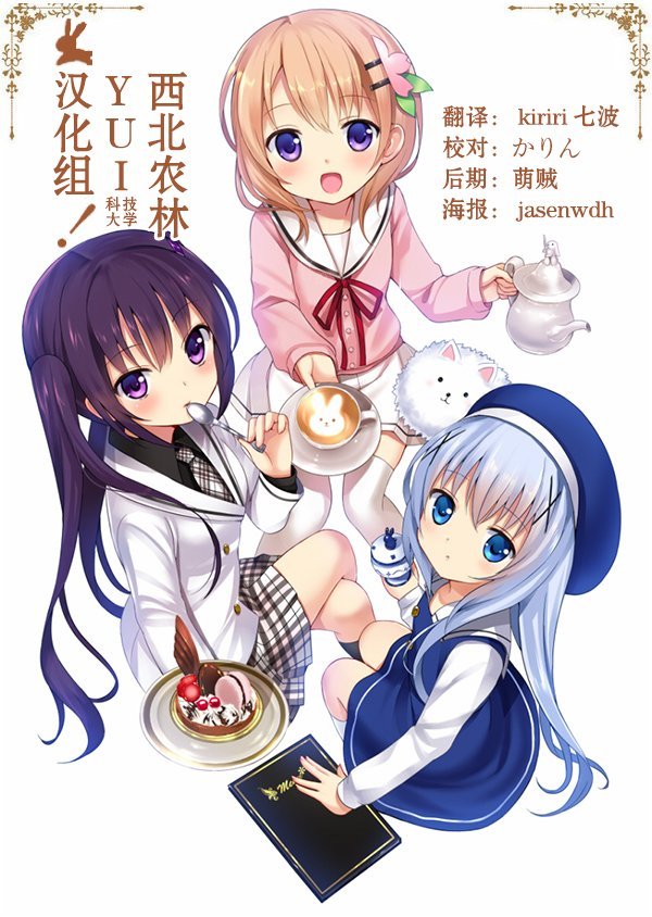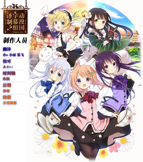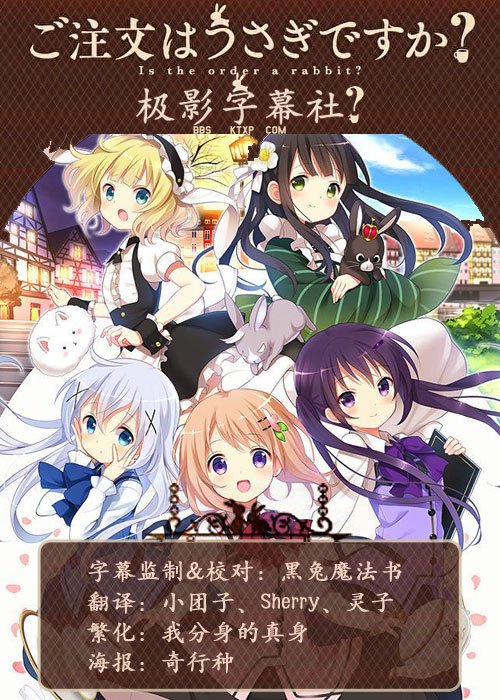 为了便于上高中,高中入学新生心爱准备搬来这由石板路、木制房组成的街道。她在寻找寄宿的地点时迷路了,迷茫之中来到了一家名为“rabbit house”的咖啡店门前。看到这间名字都充满小兔风格的可爱咖啡店,心爱忍不住踏进了店门。在店里,她遇见了娇小的少女智乃,以及一只软乎乎的可爱小兔子提比。 心爱一边喝着咖啡一边询问路线时,才惊讶的得知这家咖啡店就是自己将要寄宿的地方。因为心爱将要入学的高中有着“学生要在寄宿的家里帮忙做事”的规定,心爱便开始当起了“rabbit house”的店员,并“自称”是智乃的姐姐,一边过起了咖啡店员的生活。 坑爹网吧突然断电,弄的所有东西除了简体成品包括轴,稿子,繁体成品全没了,所以晚上再做繁体,请见谅 KTXP.COM 度盘分流: http://t.cn/8sNDj0q STORY 萌贼大丧失流着口水做的片子 STAFF 原作:Koi(芳文社「まんがタイムきららMAX」连载) 监督:桥本裕之 シリーズ构成:ふでやすかずゆき キャラクターデザイン:奥田阳介 色彩设计:佐藤美由纪 美术监督:平柳悟 撮影监督:峰岸健太郎 音响监督:明田川仁 アニメーション制作:WHITE FOX CAST ココア:佐仓綾音 チノ:水瀬いのり リゼ:种田梨沙 千夜:佐藤聡美 シャロ:内田真礼 マヤ:徳井青空 メグ:村川梨衣 青山ブルーマウンテン:早见沙织 ティッピー:清川元梦 チノの父:速水奨 官网 http://www.gochiusa.com/ ~~~~~~~~~~~~~· DMG微博:weibo.com/dmguosub DMG论坛:http://dmguo.org 招募 1、翻译校对 2、时轴&压制&海报 3、特效(ASS与AE特效) 4、片源(能录制1080i的高清片源,拥有优秀的网络环境) 招新QQ群:247135062 \(^o^)/~如有不懂或有意向欢迎进群询问~ ~~~~~~~~~~~~~~~~·· 赠品自修1080p OP&ED卡+OP某图去staff 自修 嘛 OP卡下周重弄等别的片源。。 今天赞助太坑 等其他电视台OP卡 (赞助小剧场试运行 其他的修图:ED卡+上周OP卡+第2话OP卡重修+漫画某张+截图某张(已没救 某替换帧到快吐血的兔子:MX!!!!你的画质敢再差一些么!!!!! 卖兔子肉的黑心商人:赞助已经阻止不了我了!! 我不是修图狂魔!! 修图:OP卡+ED卡+上周OP卡+特典某张+截图某张 卖兔子肉的黑心商人:赞助什么拼图解决掉了 一样做了海报去字了的图也顺带丢出来吧 修图:OP卡+ED卡+赠品x2 重修上周的OP卡+ED卡+赠品X2+本周的OP卡+ED卡 预览 预览 预览 预览 KTXP.COM 大图点这里 KTXP.COM 卖兔子肉的黑心商人:今天OP卡花屏太厉害 修图花了很久 下周丢重修 丢个OP卡替换http://pan.baidu.com/s/1mgA1zdA 下集预告吃货兔子的消失(详见小剧场 修图:OP卡+ED卡+赠品x2 预览 卖兔子肉的黑心商人:17张扫图的海报太花时间了 所以今天没空修OP卡了 见谅~ 看有人回复说右边歪了 其实原图就是那样的 当然我也不介意拉伸一下看起来正常一点 拉伸版请点这里http://pan.baidu.com/s/1mgyq8GC 修图:上周OP卡重修+这周ED卡+赠品x2 预览 卖兔子肉的黑心商人: 谁再说我看球没修图就吃了它 哼哼 下周完结 ​大波赠品9p(上周op+ed卡重修+本周的op+ed卡+赠品x4+自制壁纸一张)的预览 卖病兔肉的黑心商人:今天所有兔子都病了。。我放弃治疗了 最后一张自己扫的 不小心手抖了一下 见谅O.O~ (合集会修正图 也会有新加的 完结撒花~ opx2+edx3+赠品x4=9p 预览 大图点这里 KTXP.COM 大图点这里