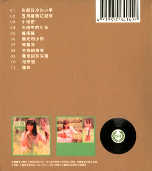 既然说银霞最具代表性的作品是“兰花草”和“你那好冷的小手”,那就顺便找来这张2009年复刻的专辑补充一下,原版在1980年就发行了,复刻忠于原版,对音质的要求不要太高了。 很多精选里面是有“你那好冷的小手”这首歌的,但喜欢老歌的朋友应该更喜欢听专辑吧。 银霞的情况就不多介绍了,她有厉害的姐姐和姐夫,一下子就把她捧起来了,不过她自己也挺努力再加点天赋,成功是必然。看过一个报道,说前两年银霞要重上舞台唱歌,在看了蔡依林和周杰伦的演唱会以后,打消了念头,说:“像我这样只是站着为观众唱歌的是不是就没人看了。”一种无奈,一种茫然。将来的舞台,是不是蔡依林、周杰伦这样的艺人也要不适应了呢?!
