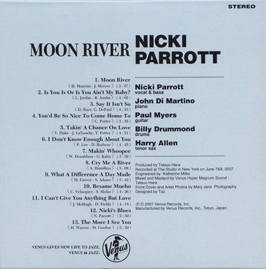 Japan's appetite for American jazz is ever increasing and their Venus Records has been releasing new material from mainstream artists that is attractively packaged and superbly recorded. Included in their catalog is Moon River, bassist/vocalist Nicki Parrott's debut as a leader.