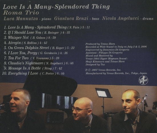 这张专辑中演奏的,多半是当时原哲夫听到的示范带中的曲子。在原哲夫的制作下,在距离罗马不远的Wide Sound录音室中,罗马三重奏录制的这张专辑的确有著让爵士乐迷们想要鼓掌叫好的因素,那就是团员之间相辅相成、各自发挥的绝佳默契。从第一曲「Love Is A Many-Splendored Thing」开始就有精彩演出,主题出现后三人立刻加足马力改变速度,将这曲柔美的音乐以激昂的方式呈现出来,接著由贝斯手Gianluca Renzi来上一段精彩的拉奏,再来则是鼓手Nicola Angelucci与钢琴手Luca Mannutza的应答对话,最后速度再度放慢,回归抒情歌曲的本质。这一气呵成的紧凑变速演出,相信任何爵士乐迷听到都会满心欢喜!这张专辑中有几首曲子都有这种少见的特技变速演奏,可见得团员之间的默契有多棒。
