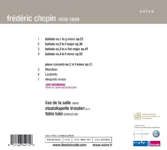 The young French pianist Lise de la Salle's new project is one of the event releases of the Chopin bi-centenary year, a recording which couples the famous Four Ballades for solo piano with a live performance of the Second Piano Concerto, performed with one of the best orchestras of the time, the Staatskapelle Dresden, under its former principal conductor Fabio Luisi.