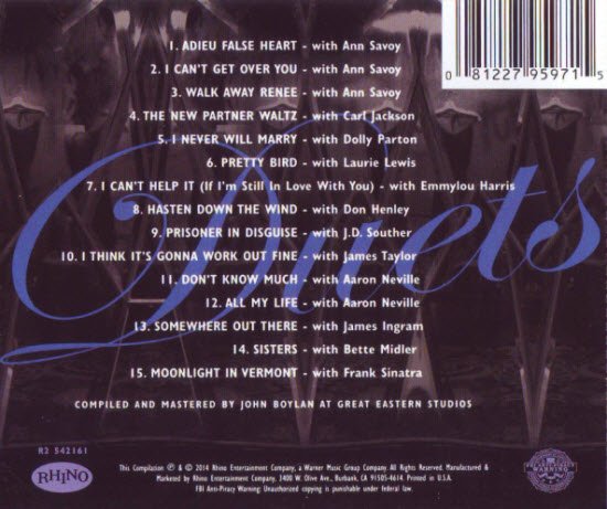 Ronstadt and her longtime manager John Boylan worked with Rhino to craft this album by helping to select the songs that indeed illustrates the arc of the development of Ronstadt's great vocal versatility, her canny selection of the songs that would showcase her vocal range and capacity, and her ability to weave her soaring voice around the voices of others in perfect harmony. Duets reminds just how much Ronstadt has meant to the world of music and just how much we miss Ronstadt and her crystalline voice.