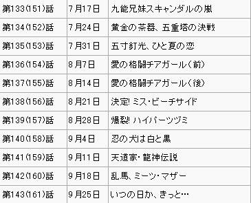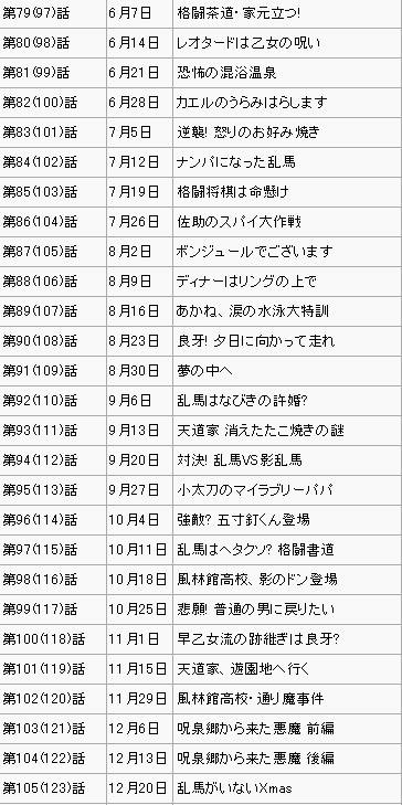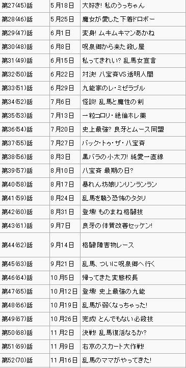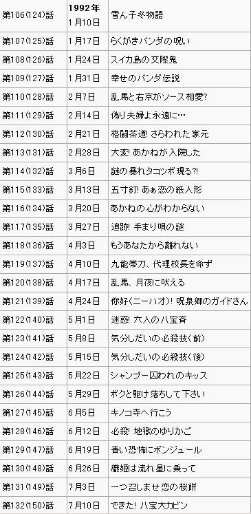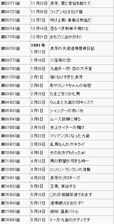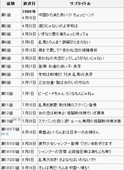 乱马½(第1期) 播放电视台 - 富士电视台 制作公司 - Kitty firm 播放期间 - 1989年4月15日~1989年9月16日(毎週六晚上7:30播出)共18集 平均收视率:9.5%、最高收视率:16.1%、最低收视率:7.1% 乱马½ 热斗篇 播放电视台 - 富士电视台 制作公司 - Kitty firm 播放日期 - 1989年10月20日~1992年9月25日 (每週五下午5:30播出)。 共143集 平均收视率:9.5%、最高收视率:15.5%、最低收视率:4.5%