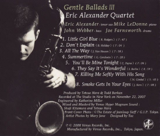 This eagerly awaited Venus release from tenor saxophonist Eric Alexander is the third in the renowned "Gentle Ballads" series. Like the earlier Gentle Ballads and Gentle Ballads II, this album is a collection of beautiful ballads that showcases the brawny and powerful Alexander's gentle and lyrical side.