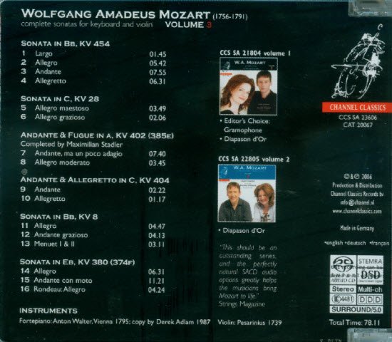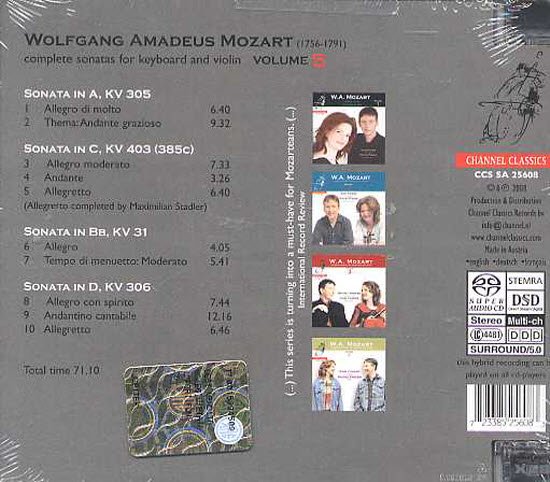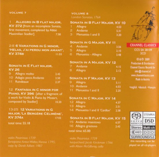 : CD 1 1. Sonata in G Major KV 379 2. Sonata in C Major KV 6 3. Sonata in F Major KV 547 4. Sonata in B flat Major KV 378 Instruments: Fortepiano: Anton Walter, Vienna 1795; copy by Derek Adlam, 1987 CD 2 1. Sonata in C Major KV 303 (293c) 2. Sonata in D Major KV 7 (1763-64) 3. Sonata in G Major KV 301 (293a) 4. Sonata in F Major, KV 30 (1766) 5. Sonata in E flat Major KV 481 Instruments: Fortepiano: Anton Walter, Vienna 1795; copy by Derek Adlam, 1987 Violin; Pesarinius 1739 CD 3 1. Sonata in Bb, K.454 [Vienna, 21 April 1784] 2. Sonata in C, K.28 [The Hague, Feb 1766] 3. Andante & Fuge in a, K.402 (385e) [Vienna, 1782 4. Andante & Allegretto in C, K.404 (385d) [Vienna, 1782] 5. Sonata in Bb, K.8 [Paris, Jan. 1764] 6. Sonata in Eb, K.380 (374f) [Vienna, 1781] CD 4 1. Sonata in Eb, K.302 (293b) 2. Sonata in G, K.9 3 Allegro spiritoso 3. Sonata in e minor, K.304 (300c) 4. Sonata in D, K.29 5. Sonata in A, K.526 CD 5 1. Sonata in A, KV 305 2. Sonata in C, KV 403 (385c) 3. Sonata in Bb, KV 31 4. Sonata in D, KV 306 CD 6 1. Sonata in F major, KV376 (374d) 2. Sonata in C major, KV296 3. Sonata in F major for Pianoforte KV App. 135 (547a) 4. Sonata in G major, KV27 CD 7 Vol. 7 1. Allegro in Bb major, K.372 [from an incomplete Sonata first movement, completed by Abbe Maximilian Stadler] 2. Sonata in Eb major, K.26 3. Fantasia in C minor for Piano, K.394 [after a fragment of a work for Violin & Piano by Mozart, composed by Stadler] 4. 12 Variations in G major, 'La Bergère Célimène' K.374a 5. 6 Variations in G minor, 'Hélas, j'ai perdu mon amant' K.374b Vol. 8 1. Sonata in B Flat Major, KV10 2. Sonata in G Major, KV11 3. Sonata in A Major, KV12 4. Sonata in F Major, KV13 5. Sonata in C Major, KV14 6. Sonata in B Flat Major, KV15