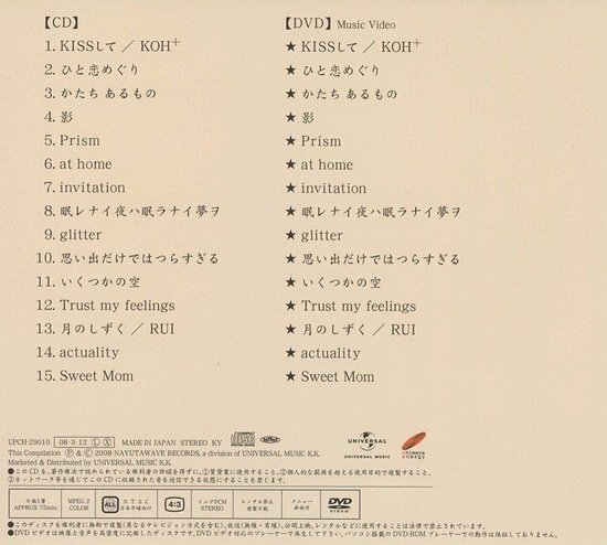 : 01. KISS and (KOH +) 02. Over a love 03. Some form of 04. 影 05. Prism 06. at home 07. invitation 08. Lena Lee Ha sleepy sleepy night lanai dream WO 09. glitter 10. Memories are just too painful 11. Several empty 12. Trust my feelings 13. Moon drops (RUI) 14. actuality 15. Sweet Mom