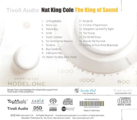 纳京高的醇厚歌声,大概是每个世纪聆听西洋爵士音乐的乐友们共同的回忆,如今经由坚强的录音后制,我们在这张「皇帝老歌」里,可以听到最棒的纳京高!说这一张「皇帝老歌」SACD 是普通的发烧片,那就是太小看它了!它不仅收录了纳京高演唱生涯里最著名的 17 首作品,在后制的过程中,Tivoli Audio 还提供相关顶级器材,同时倾全力品质监控,使得这张 SACD 从头到尾都呈现一致的高品质,整体更具有器材鑑听的水平,没有任何灌水之嫌。从一开始的 Unforgettable,我们又重温了纳京高深具磁性的嗓音。而「皇帝老歌」的另一个重点,就在歌声后面所搭配的琴声。