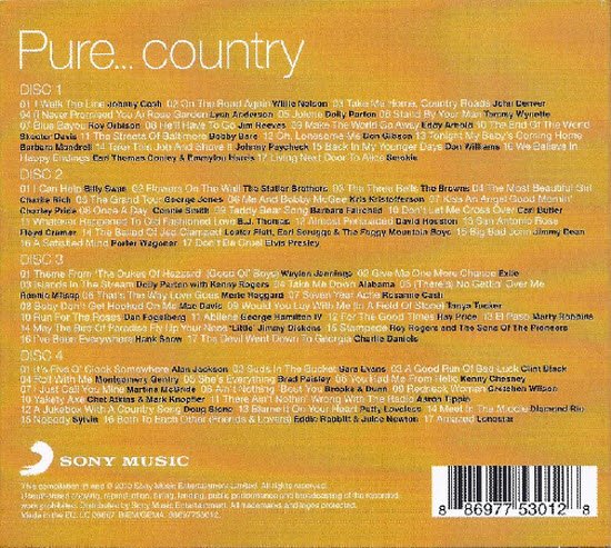 Pure...Country is a decent four-CD set highlighting 68 classic singles. Along with the original versions of radio favorites by Johnny Cash, George Jones, Willie Nelson, Ray Price, and Lynn Anderson are less than obvious inclusions by the Browns, Sylvia, and Little Jimmy Dickens.