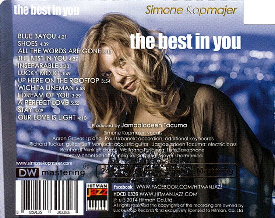 席捲香港、新加坡发烧界的澳洲爵士新天后 60.70黄金年代金曲温柔再现 来自奥地利的新声代爵士女伶---席梦卡麦儿Simone Kopmajer,自上张〈Nothing’s Gonna Change坚定不移〉席捲香港、新加坡发烧乐迷界,睽违几年后,準备再次带给您更贴进心房、更富爵士风情的金曲回忆。 The Best in You Simone Kopmajer Released on May 9, 2014 by Lucky Mojo Records Main artist : Simone Kopmajer Genre : Pop/Rock > Pop It was Simone’s idea to take the great songs of different generations and put all together in what could be considered a level playing field. «I love to sing the great jazz standards,» the 20-something Austrian native tells me, «but, great as they are, I don’t want to sing them exclusively.» Thus she mixes it up–going seamlessly from the music of Prince and Motown to that of the Gershwins and Rodgers & Hart. She varies between the old and new, which is entirely logical considering that virtually all of them are considerably older than she is. She also includes music from both Broadway and Nashville–also a logical choice considering that New York and Tennessee are roughly equidistant from Vienna. Simone takes an evocative country-folk song associated with Alison Kraus, and, with her stunning voice and the combined musicality of herself and co-producer/pianist John di Martino, makes it into something even more special. «I was driving from one show to another in the States, when I heard it on the car radio.» she reports, «I couldn’t get all the details, but I eventually figured out what the song was. Before I could find the sheet music, I wrote out the chords myself.» It’s a beautifully sung and even haunting performance–in more ways than one. The new CD also includes three excellent original songs, my favorite of which is «Didn’t You Say.» «It’s about these men that promise you all kinds of things, and then in the end, they don’t deliver anything.» She tells me it’s inspired by real relationships, and I tell her she’s too young to be so cynical. However, the Count Basie-style beat provided by the combination of di Martino and ace rhythm guitarist helps negate any possible ill will, and «Didn’t You Say» turns out to be a real romper after all. Meet a fresh, young singer from Austria, whose US debut in the year 2000 was hailed as "captivating“. Jazz legend Ira Sullivan calls her “a great young talent” with a big future in Jazz. Simone, now 25 years old, grew up in a family of musicians and started to sing, in her father's band when she was 12. At the same time she studied piano, though singing remained her first love. Early on, she entered and won various talent contests and even made appearances on television in her native land, Austria. As a young performer, she twice toured the Netherlands with the “Euro Big Band” and later appeared in several International Jazz Festivals. Influenced by some of the great American vocalists, Frank Sinatra, Ella Fitzgerald, and Jon Hendricks, Simone has developed into a true Jazzsinger, a singer who uses a wide variety of rhythms and excels in her very individual style of scatting. Laurie Antonioli says that “Simone is an excellent musician, with soulful and hip improvising. She digs in and isn't afraid to take risks with the music”. Simone received her Masters Degree from the University for Music and dramatic Arts in Graz, Austria where she had the opportunity to work with such Jazz luminaries as Mark Murphy, Sheila Jordan, Michele Hendricks, Jay Clayton and the New York Voices. Simone Kopmajer´s new album containing mostly original compositions and songs like Wichita Lineman, Blue Bayou and Impossible was produced by Jamaaladeen Tacuma and recorded in Philadelphia. Highly recommended for Jazz & Singer/Songwriter Lovers ! Genre: Jazz: Jazz-Pop Release Date: 2014