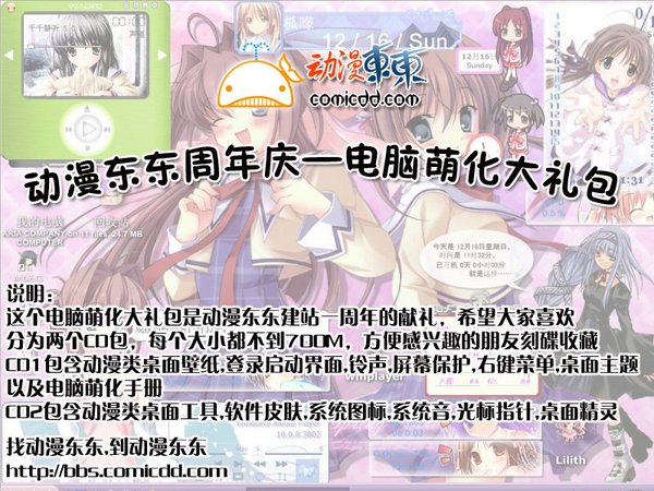 动漫东东http://www.comicdd.com建站一周年之际,我们筛选出一年来ACG类软件皮肤、桌面主题、图标指针、屏幕保护、系统音、桌面精灵、工具等方面的优秀作品,集合为一个大礼包奉献给大家,希望大家喜欢。