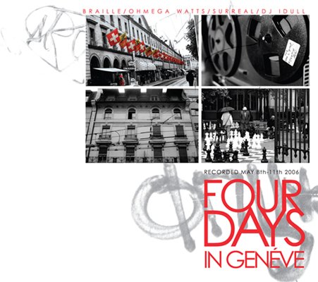 这是放寒假时淘到的一张碟,当时封面吸引了我,感觉很有地方特色,本以为会是一张充满地域色彩的专辑,没想到却通篇的Hip-Hop,不过确实很好听,希望大家会喜欢! Braille, Ohmega Watts, Surreal and DJ Idull join together to bring you "4 Days In Geneva". During a European tour the crew had 4 Days off in beautiful Geneva Switzerland. Rather then sitting on their hands, they decided to rush into a local studio and create some fresh tunes. After collecting records during the tour, Ohmega had a crate full of local flavor. All the mcs had their pens ready to share and the result is available now in audio form. This is what happens when 4 talented artists get locked in the studio for 4 days. Honest music, no pressure from outside labels, influences or radio. Just strait up hiphop music from the heart and soul. The music feels good cause the artists had fun while they were making it. Working hard during their vacation to bring fresh new audio treats. 原版CD压制:256kpbs