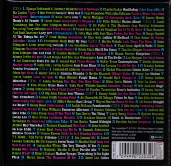 : CD 1 01. Django Reinhardt - Coleman Hawkins - Out Of Nowhere 3:19 02. Charlie Parker - Ornithology (Live - Storyville) 4:24 03. Ike Quebec - Topsy (1998 - Remaster) 3:00 04. Bud Powell - Bouncin With Bud 3:01 05. Paul Chambers With John Coltrane - Tranes Blues (aka John Paul Jones) (Instrumental) 6:56 06. Miles Davis - Jeru (Rudy Van Gelder) (2000 - Remaster) 3:11 07. Gerry Mulligan - Ill Remember April (Live) (1996 - Remaster) 4:15 08. James Moody - Moodys All Frantic 2:34 09. Count Basie - Sleepwalkers Serenade (1994 - Remaster) 3:36 10. Billie Holiday - Detour Ahead 3:01 CD 2 11. Louis Armstrong And The Duke Ellington Orchestra - Azalea 5:01 12. Gil Fuller & The Monterey Jazz Festival Orchestra Featuring Dizzy Gillespie - Man From Monterey (feat. Dizzy Gillespie) (2007 - Remaster) 3:57 13. Count Basie & Sarah Vaughan/Sarah Vaughan - You Go To My Head 4:50 14. Fats Navarro And Tadd Dameron - Lady Bird (Instrumental) (1989 - Remaster) 2:50 15. Jutta Hipp with Zoot Sims - Violets For Your Furs (Rudy Van Gelder Edition) (2007 - Remaster) 6:09 16. Serge Chaloff - All The Things You Are 5:24 17. Hank Mobley - Remember 5:39 18. Stan Getz - Lullaby Of Birdland 2:25 19. Chet Baker - My Funny Valentine (Instrumental) 2:17 20. Thelonious Monk - Ruby My Dear (Rudy Van Gelder Edition) (1998 - Remaster) 3:07 CD 3 21. Herbie Nichols - Lady Sings The Blues 4:23 22. Duke Ellington & Louis Armstrong - Solitude (1990 Digital Remaster) 4:52 23. Lou Donaldson - Carvin The Rock 3:57 24. Thad Jones - April In Paris (Rudy Van Gelder Edition) (2007 - Remaster) 6:38 25. Duke Ellington - Fleurette Africaine (African Flower) (1986 - Remaster) 3:33 26. Sonny Clark - Dial S For Sonny (Rudy Van Gelder Edition) (2004 - Remaster) 7:23 27. Charles Mingus - Summertime (1997 - Remaster) 4:37 28. John Coltrane - One And Four (1990 - Remaster) 7:35 29. Freddie Hubbard - A Night In Tunisia 10:25 30. Wayne Shorter - Footprints 7:26 CD 4 31. Johnny Griffin - Mil Dew (1987 - Remaster) 3:53 32. Art Blakey And The Jazz Messengers - Look At The Birdie (1999 - Remaster) 6:43 33. Lee Morgan - The Sixth Sense (Rudy Van Gelder Edition) (2004 - Remaster) 6:43 34. Joe Henderson - Mode For Joe (Rudy Van Gelder Edition) (2003 - Remaster) 7:59 35. Donald Byrd - Three Wishes (Rudy Van Gelder) (2003 - Remaster) 5:10 36. McCoy Tyner - Contemplation (Rudy Van Gelder Edition) (1999 - Remaster) 9:09 37. Herbie Hancock - Maiden Voyage 7:52 38. Holly Cole / Javon Jackson - Hum Drum Blues 5:35 39. Joe Lovano - Im All For You 7:46 CD 5 40. Stanley Jordan - Freddie Freeloader 5:51 41. Cannonball Adderley - Somethin Else 8:10 42. Michel Petrucciani - Limbo (Live) 8:04 43. Horace Silver - Que Pasa 5:35 44. Walter Davis Jr. - Rhumba Nhumba (Rudy Van Gelder Edition) (2007 - Remaster) 6:55 45. Herbie Hancock - Oliloqui Valley (Rudy Van Gelder Edition) (1999 - Remaster) 8:26 46. Kenny Cox - Diahnn (2007 - Remaster) 8:36 47. Dexter Gordon - Love For Sale 7:33 48. Blue Mitchell - Fungii Mama (Rudy Van Gelder) (2004 - Remaster) 7:48 49. Donald Byrd - Shangri-la (2006 - Remaster) 6:34 50. Kenny Dorham - Una Mas (One More Time) 15:15 CD 6 51. Sonny Rollins - Misterioso (The Rudy Van Gelder Edition) (1999 Remaster) 9:20 52. Miles Davis - Weirdo (Rudy Van Gelder 1998 - Remaster) 4:42 53. Pete La Roca - Lazy Afternoon (1995 - Remaster) 5:30 54. Tina Brooks - Minor Move 6:37 55. "Baby Face" Willette Quartet - Somethin Strange (Rudy Van Gelder Edition) (2007 - Remaster) 6:41 56. Milt Jackson - Bags Groove (Rudy Van Gelder 2001 - Remaster) 3:04 57. Bobby Hutcherson - West 22nd Street Theme (1994 - Remaster) 4:41 58. Stanley Turrentine - Rivers Invitation 6:14 59. Kenny Burrell - Chitlins Con Carne 5:25 60. Big John Patton - Soul Woman 7:40 CD 7 61. Jimmy Smith - See See Rider (2004 - Remaster) 6:33 62. Grant Green - The Final Comedown 3:24 63. Lonnie Smith - Turning Point (Rudy Van Gelder) (2004 - Remaster) 8:21 64. Art Ensemble Of Chicago - Thème De Yoyo 9:00 65. Don Ellis Orchestra - Passacaglia And Fugue (Live) (1998 - Remaster) 6:29 66. Clifford Brown - Easy Living 3:43 67. Wayne Shorter - House Of Jade 6:51 68. Gil Evans - Straight No Chaser (2006 - Remaster) 6:48 69. Kenny Drew - Undercurrent (Rudy Van Gelder Edition) (2007 - Remaster) 7:16 70. Jackie McLean - Frankenstein 7:27 CD 8 71. Eric Dolphy - Something Sweet, Something Tender (Rudy Van Gelder Edition) (1999 - Remaster) 6:00 72. Tony Williams - Tomorrow Afternoon (1987 - Remaster) 5:29 73. Ornette Coleman Trio - Dee Dee (Live) (2001 - Remaster) 10:26 74. Andrew Hill - Siete Ocho 8:59 75. Chick Corea - Song Of The Wind 6:44 76. Don Cherry - The Thing (2005 - Remaster) 5:47 77. Larry Young - Visions 6:41 78. Wynton Marsalis - Donna Lee 6:49 79. Sam Rivers - Luminous Monolith 6:28 80. Grachan Moncur III - Monk In Wonderland (1988 - Remaster) 7:50 CD 9 81. Jacky Terrasson - Un Poco Loco (Alternate Take) 5:35 82. Lee Konitz - Round Midnight 12:42 83. Patricia Barber - Morpheus 4:33 84. David Axelrod - Holy Thursday 5:27 85. Terence Blanchard - Flow Part 1 5:28 86. John Scofield - Do Like Eddie 8:06 87. Stacey Kent - Never Let Me Go 4:37 88. Gonzalo Rubalcaba - Silencio (Silence) 3:40 89. Dianne Reeves - Softly As In A Morning Sunrise 4:51 90. Joe Lovano - Oh! 6:21 CD 10 91. T.S. Monk / Ron Carter - Evidence 4:42 92. Lionel Loueke featuring Herbie Hancock - Seven Teens 6:53 93. Martial Solal - Body And Soul (Live 01) 7:55 94. Jason Moran - Blue Blocks 4:33 95. Cassandra Wilson - The Very Thought Of You 4:43 96. Medeski, Martin & Wood - Partido Alto 5:42 97. Marc Moulin - What? 5:57 98. Robert Glasper - Maiden Voyage / Everything In Its Right Place 8:42 99. Norah Jones - The Nearness Of You 3:04 100. Amos Lee - Colors 2:40
