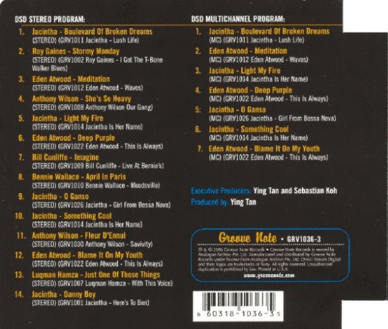 这张唤作《True Audiophile》的The Best Of Groove Note,网尽了Groove Note多年来的精彩录音,是一张很不错的发烧试音唱片,《True Audiophile》这个名字改得相当好,是要告诉给人知道,这确是真真正正的发烧录音来。碟内辑有十四首两声道及七首多声道的乐曲,其中Groove Note的台柱躉Jacintha便佔了当中五首之数,〈Boulevard Of Broken Dreams〉的低频「一浸浸」地浸出来,大有水银泻地的感觉;另一首〈O Ganso〉是Jacintha改变歌路的bossa nova作品,鼓与敲击的清劲结实,像真度高且富有节奏的刺激感;而〈Danny Boy〉一曲以清唱作开首,口形玲瓏浮突地悬吊在半空,人声动态极强,可考起音响组合的重播能力了。