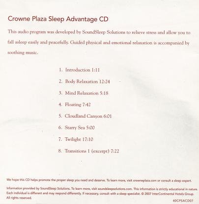 本碟是2006年岁末在 加拿大 入住皇冠假日酒店(Crowne Plaza)时赠送的一张睡眠专辑,由“皇冠假日酒店”美国洲际酒店管理集团特约提供。