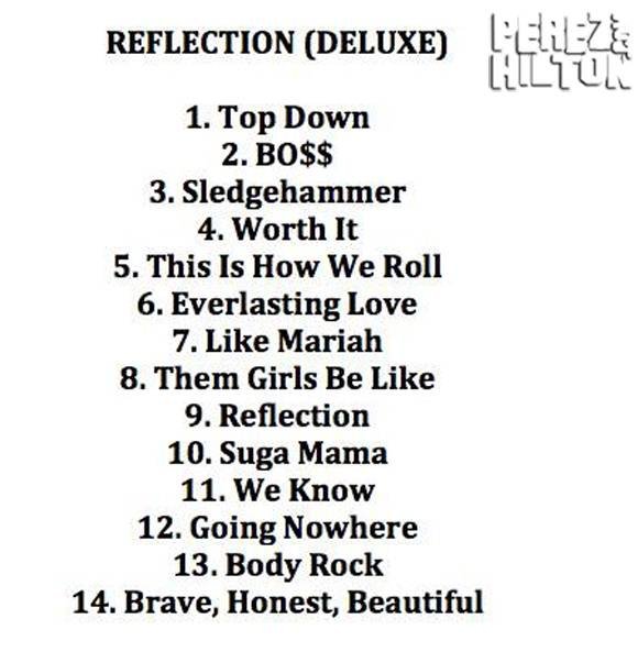 : 1. Top Down 3:40 2. BO$$ 2:51 3. Sledgehammer 3:50 4. Worth It (feat. Kid Ink) 3:44 5. This is How We Roll 4:32 6. Everlasting Love 3:04 7. Like Mariah (feat. Tyga) 3:28 8. Them Girls Be Like 2:42 9. Reflection 3:08 10. Suga Mama 3:39 11. We Know 2:57 12. Going Nowhere 13. Body Rock 4:03 14. Brave Honest Beautiful (feat. Meghan Trainor) 3:28