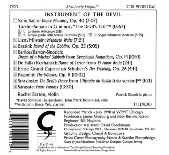 : 01. Danse macabre, symphonic poem in G minor, Op. 40 02. Sonata for violin & continuo in G minor, B. g5 ('The Devil's Trill'): I. Larghetto Affectuoso 03. Sonata for violin & continuo in G minor, B. g5 ('The Devil's Trill'): II. Tempo guisto della Scuola Tartinista 04. Sonata for violin & continuo in G minor, B. g5 ('The Devil's Trill'): III. Sogni dellautore: Andante 05. Mephisto Waltz (I & II), for piano No. 1 (Der Tanz in der Dorfschenke), S. 514 (LW A189) 06. La Ronde des Lutins, scherzo fantastique for violin & piano, Op. 25 07. Symphonie fantastique for orchestra ('Episode de la vie d'un Artiste...en cinq parties'), H.48 (Op. 14): Dream of a Witches' Sabbath 08. El Amor brujo, chamber version for 2 violins, viola, cello, bass & piano, G. 48: Dance of Terror 09. Grand caprice on Der Erlkönig, for solo violin (after Franz Schubert), Op. 26 10. Le streghe, variations for violin & orchestra in E flat major, Op. 8, MS 19 11. L'histoire du soldat (The Soldier's Tale), suite transcribed for violin, clarinet & piano: The Devil's Dance 12. Fantasy on Gounod's 'Faust,' for violin & orchestra (or piano), Op. 13