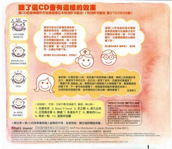 用音乐再现妈妈肚中的环境!为了宝宝与家人的摇篮曲!   让宝宝放轻松不再哇哇哭的神奇CD,获日本特准许可认定的专业音乐制作!以Kiroro的经典曲目演奏,金城绫乃亲笔写下实用育儿秘笈!!   利用销售50万张以上的有效技术,加上能让心情轻松,温暖的Kiroro音乐旋律,让大家一起放松!企划●福田稠(医疗法人 爱育会 福田医院理事长 医学博士)/编曲●神山纯一   “宝宝不哭 摇篮曲”的诞生由来   胎儿在母体怀孕5个月大的时候,耳朵的构造发育完成,从母体怀孕8个月的时候开始就可以听到声音,而且会记住那声音,所以出生后,再度聆听会让他心情安稳,睡得也安稳。婴儿在子宫内可以听到的周波数声音,是具有镇静作用的,这是众所皆知的事。日本VICTOR运用专业技术,并获得日本特别许可认定所制作出的“宝宝不哭CD”,这是让即将分娩的孕妇聆听钢琴,横笛等40种乐器的音阶,同时在子宫内装入超小型麦克风录音,制作出胎儿在妈妈肚子里所听到的音乐再现。以胎内音的方式来演奏出Kiroro美丽而沉稳的旋律。让妈妈的心情也同样受到安抚,小宝宝可以睡得更好。   当我第一次看到这CD时,是我还不熟悉照顾小宝宝,精神上的负担非常的大,看着哭不停的女儿,自己也一起哭了起来,但当我试着播放了“宝宝不哭 摇篮曲”后,刚开始她只是转着大大眼睛看不停,听着听着就安静下来,不一会儿她就睡着了。我简直是感动的要痛哭流涕!!!没想到竟有这样的事,后来连我自己竟也听一听就睡着了。~By金城绫乃   作曲:玉城千春/金城绫乃 编曲:神山纯一   这CD的效果会因个人差异而不同,在使用前,请仔细详阅说明书。   只有日本VICTOR才有的“宝宝不哭CD”的秘密!宝宝在子宫内听得到的范围的周波数声音,有镇静的作用。在获得产妇的了解许可后,将超小型的麦克风放入橡皮气球内插入超过预产期,需要人工催生的产妇之子宫颈内,重现胎儿所听到的乐器声音,确立跟宝宝在子宫内所听到的声音是同样音质的录音方法。这CD的音乐制作方法是经过日本特别许可认定的!