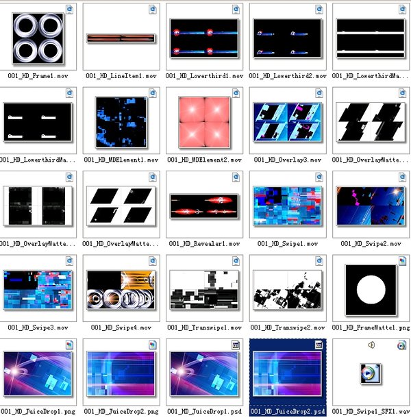 为网络质量优化的组合; 250多个动画和图形; 包含HD和SD版本; 11DVD; QuickTime格式; 附送Juicer 2处理软件可将相应的动态素材转换为PAL,NTSC或DV格式; 也可输出为AVI,MOV及图像序列文件。