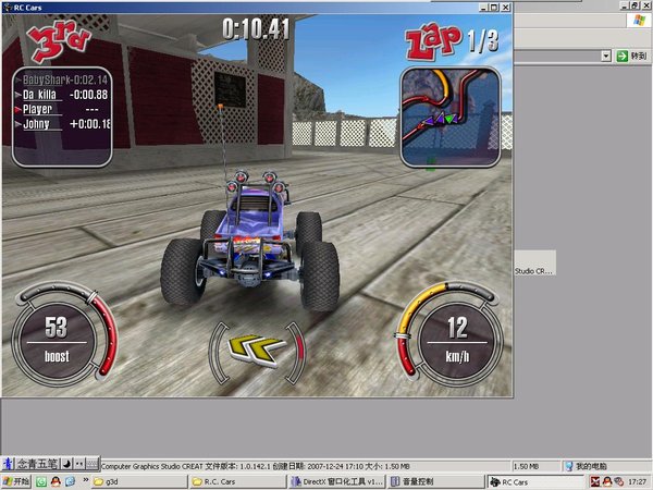 【游戏介绍】 游戏简介(摘自eNet游戏先锋): 今年早些时候,游戏开发小组在PS2上推出了一款名为RC CAR的游戏。这个游戏以简单为特色,游戏方式给人深刻的印像。现在,几个月之后, PC上的RC终于推出了。 RC汽车以3 种不同的类型为特色。汽车开始相当过分简化,你要以遵守规则,得到冠军的方式去升级他们。 在这个游戏中,赢得比赛将为你赢得现金,你能使用这些奖金升级你的汽车的发动机、速度推进器、以及轮胎。 但是不是每个零件都要求升级,因此你在一定水平的时候,必须保持资金的数量。 而且,比赛以你能与任何可能遇到的汽车或者在一个轨道的迅速比赛方式为特色。 另外,有与二名玩家分割屏幕,适合单个计算机上6 名参赛者一起玩的多人方式。 大概,这种在线的方式与你能建立或者参加的房间有关,争取尽量能够当上房主啊。 RC汽车最好的方面之一也就是给人以直觉的感观。 你的基本控制与加速器,刹车,手力制动器有关。 你的涡轮机推进多久,取决于你多长时间使用它一次。 那些比赛非常好,并且那些应用于物理学的汽车令人吃惊,虽然他们不是十分实际。 而且, 我们发现控制器和标准控制方案键盘同样流畅的操作, 因此不管你习惯于哪个,你都能够轻易操作。 【游戏截图】