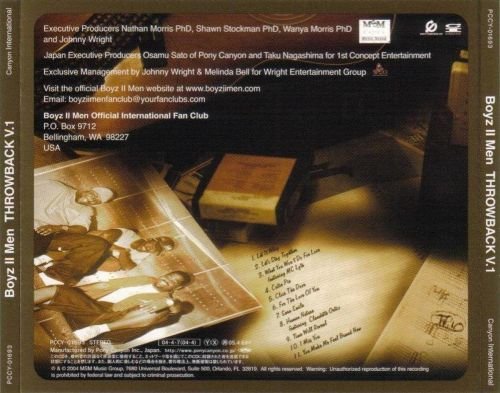《Throwback Vol. 1》是Boyz II Men 2004年的一张翻唱专辑,收录了11首经典老歌的重新演绎。这张专辑也是他们第一次尝试三重唱,因为老团员Michael McCary在2003年已经离开了团队,在所难免的给Boyz II Men带来了和声的硬伤。这可以说是Boyz II Men具有转折意义的一件事,他们也没有寻找新的团员,一直保持三人和声。团队在这之后沉寂了很久。直到2006年才重新创作发行了新专辑《The Remedy》(上一张原创专辑是2002年的《Full.Circle》,整整时隔4年),但是已经难以再现辉煌了。不管怎样,Boyz II Men永远是我最喜欢的男子和声团体,永远支持他们。