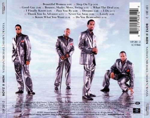 还记得和Mariah Carey合唱《One sweet day》并创下连续16周排行榜冠军成绩的那些家伙吗?不光如此,《End of the road》和《I'll make love to you》也成了榜高居NO.1十几周的"老顽固"。由四个其貌不扬的黑人组成的BoyzIIMen合唱团一直以来都是用他们近乎完美的歌唱技巧与感情细腻的无瑕合音深深打动人们的心。 《Nathan Michael Shawn Wanya》是BoyzIIMen他们出道来第五张专辑,由四位成员的名字命名。开头一曲拉丁风格的《Beautiful women》用流水线般快速滑动的节奏把四个人的声音表现得十分到位。接下来的《Step on up》便开始了他们极具攻击力的合声,尤其在结尾部分的几种伴奏乐器逐渐消失,最终过滤得只剩下纯洁的音质。《Good guy》中的电子乐同吉他的结合再配上他们的声线让全曲成了一首不错的快歌。《I finally know》中若隐若现的钢琴声似乎特别为他们特殊唱腔作铺垫,值得细细品味。主打单曲《Pass you by》仍然展现其经典BoyzIImen民谣风格,是一首非常动听和吸引人的佳作,Shawn和Wanya在里面相互飙歌的本事永远是金字招牌。《Dream》全曲十分舒缓,Wanya在里面的高音值得反复体味。《I do》,上帝,你听过这么有磁性却又清新的唱腔吗?前半段完全是清唱的,你会以为那出色的声音是后期制做的,全歌的天籁合声根本就是无懈可击的。《Thank you in advance》这首歌歌词比较有趣,讲述男主人公在面对一个陌生的女孩时"觉得你看起来像我的前妻,尽管我以前还没有结婚过"的种种幻想,一反以往欢快的节奏,改用深邃的方式来表现,感觉起来更加舒心悦耳。《Never go away》是可以杀死人的软式情歌,一开始依旧是Michael十分性感的念白,而那句飘渺的 "Never Never go Never go away from me"始终贯穿全曲,余音不绝。《Lovely》同样是首慢歌,里面的合声听不出是合声更像是天然的伴奏音乐,他们采取了相互重迭的唱法,给人一种海浪远远而来缓缓冲刷沙滩的感觉。《Kown what you wantt》伴奏很简洁,却在他们四人的一贯的"挖掘式"唱法里把最特别,最隐蔽,最高潮的部分提炼出,不得不让人佩服他们过硬的实力。(转)
