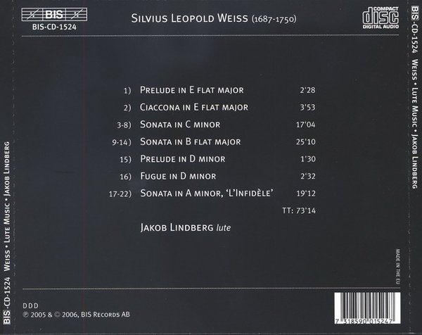 : 01. Prelude in E flat major 02. Ciaccona in E flat major 03. Sonata in C minor - Fantasie 04. Sonata in C minor - Allemande 05. Sonata in C minor - Courante 06. Sonata in C minor - Sarabande 07. Sonata in C minor - Gavotte 08. Sonata in C minor - Gigue 09. Sonata in B flat major - Prelude 10. Sonata in B flat major - Ouverture 11. Sonata in B flat major - Courante 12. Sonata in B flat major - Bourree 13. Sonata in B flat major - Sarabande 14. Sonata in B flat major - Presto 15. Prelude in D minor 16. Fugue in D minor 17. Sonata in A minor, 'L'Infidele' - Entree 18. Sonata in A minor, 'L'Infidele' - Courante 19. Sonata in A minor, 'L'Infidele' - Sarabande 20. Sonata in A minor, 'L'Infidele' - Menuet 21. Sonata in A minor, 'L'Infidele' - Musette 22. Sonata in A minor, 'L'Infidele' - Paysanne