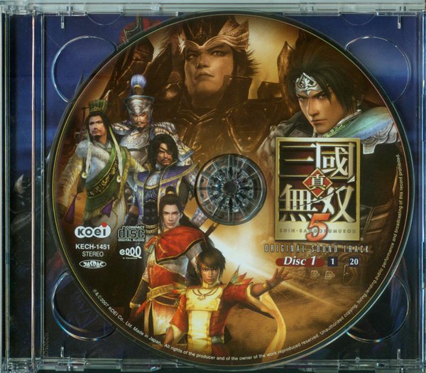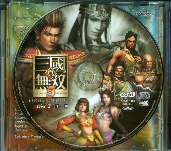 MASA (Disc1: 1,2,5,6,7,8,9,13,16,17,18 Disc2: 7,9,12,15,20) Masato Koike (Disc1: 4,11,15,20 Disc2: 1,2,5,8,11,16,17,19) Kensuke Inage (Disc1: 3,12 Disc 2: 3,6,13) Haruhi Yamada (Disc1: 10,14 Disc2: 4,10,14,18) Michihiko Shichi (Disc1: 19) 光荣公司日前公开了《真三国无双5》的原声 CD 发售日和售价,真三国无双 5 的 OST 将于 2007 年 12 月 5 日上市,售价 3200 日元。初回特典为:辉煌贴纸。CD 共有两张,附送的小册子则包含了作曲的全乐曲解说, CD上 则收录有 2007 年 11 月 11 日上市的 PS3 和 XB360 用游戏《真三国无双 5 》的全 40 首 BGM 。