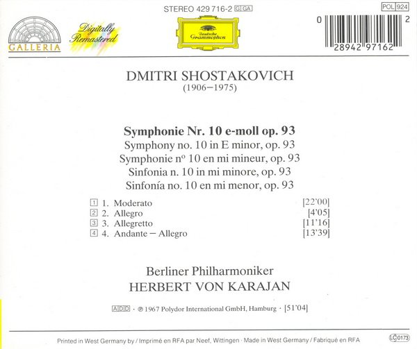 碟中收录了肖斯塔科维齐:《第十交响曲》,卡拉扬指挥、柏林爱乐乐团演奏