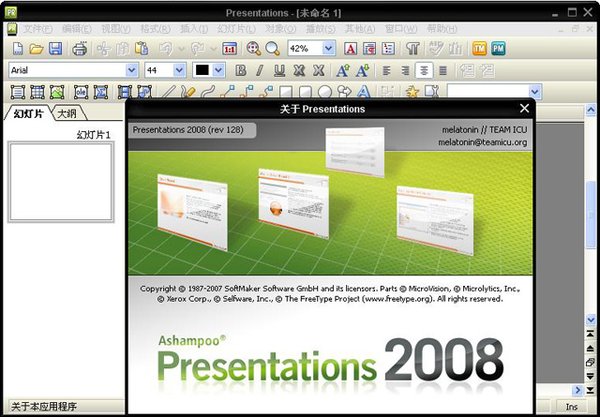 Ashampoo Office 2008 包含三个组件:文字处理工具 TextMaker 2008、电子表格制作工具 PlanMaker 2008、演示文稿制作工具 Presentations 2008。