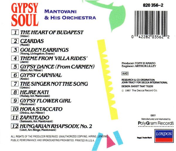 从一个小的版面复制来看,有点难说,但是这个收藏再发行盘 包括两个完整的Mantovani 黑胶版,吉普赛人! (1968年),1973年在美国出版的吉普赛灵魂,1958年在立体声展示会上 演示立体声技术可能性的CD。后一张专辑从来没有在CD上发行,这对喜轻音乐易听风格感兴趣的买家而言是不容错过的。 这张专辑的主打曲由指挥口头直接介绍; 作为指挥的的 安南西奥·保罗曼托瓦尼 七岁时来到英国,也尽其所能融入英国。他炫耀立体声格式的优点(STEER-e-o),告诉你听到的管弦乐队的乐器就好像你坐在他们前面一样;当然不是真的,但是你在50年代后期就会感受到这种技术的新颖性。 专辑中的作品被选为演示立体声效果,在这样做的过程中,他们提供了Mantovani的一些安排。吉普赛灵魂LP重新审视了Mantovani自己之前的轻音乐的一些经典,至少与吉普赛主题鬆散相连。像Jeno Hubay的Hejre Kati(第8轨)一样,在其受欢迎程度的尾端,随著音乐的减少而消失,现在正在反弹。整个制作过程当然是相当丰富多彩的,有很多的打击乐,但是在开幕式上听到的cimbalom,布达佩斯的心臟(由模糊的Imry Vidor组成)仍然是一个意想不到的乐趣。这张专辑包括几个Mantovani自己的作品,以及由罗纳德·比格(Ronald Binge)提供的李斯特的匈牙利狂想曲2号的拉出式安排,作为导演本人他负责Mantovani的声音。转盘仍然可以通过 当地的节俭店购买到Mantovani的廉价版,这个很不错重新发行的版本似乎是理所当然的。