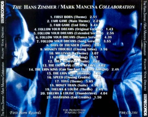 这张名为《The Hans Zimmer / Mark Mancina Collaboration(合作)》的Bootleg是Hans的诸多Bootleg中比较有名的一张,实际上被认为是《Follow Your Dreams》的第一辑,同时这张专辑也是Hans诸多精选集中质量上乘的一张,不仅选曲独到,更囊括了特别曲目“Follow Your Dreams”的四个版本。专辑整体风格犹如封面所呈现的一般,在非洲大草原,从地平线上冉冉升起一轮红日的时候所带来的振奋与激昂。比起Vol.2,我更喜欢这张Vol.1。