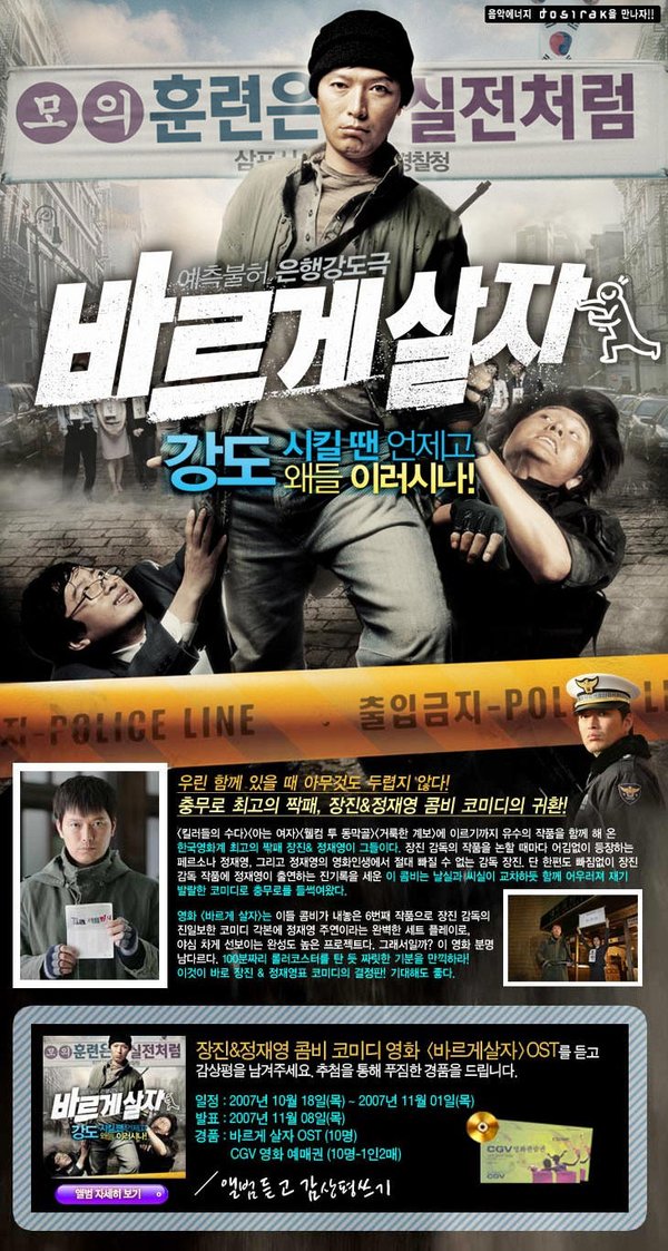 导演:罗熙赞 主演:郑在泳 孙秉浩 李汉威 前所未闻的银行抢劫案模拟训练,因为一个呆板的巡警使那场训练变成了无法挽回的实际情况.参与训练的人们都想早点结束,而郑道万却无视那些人的心情,发挥出了他模范强盗的专业精神,一个一个说服着那些人质们。他们的脑子里想的都是要把使命成功地完成。就因为他身为强盗的热血精神,模拟训练看不到尾声,最终以特别机动部队的加入变成在电视上都要现场直播而被全国关注的大型训练,这场风波变得越发猛烈!