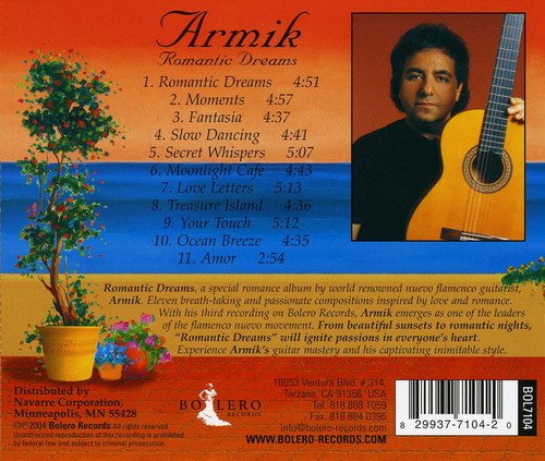 阿米克(Armik)是亚美尼亚裔伊朗人,为当代最杰出的新佛朗明哥吉他大师,他的音乐融合了拉丁-吉普赛-爵士元素而形成独特的风格,在热情洋溢的佛朗明哥节奏中仍然带著一些细腻的伤感与脆弱的情丝。他的音乐让你神游在无国界的香格裏拉乐园中浑然忘我。阿米克(Armik)已经出版过十多张专辑,这张《Romantic Dreams(浪漫之梦)》是他的代表作之一,有如火一般的热惰并交混传统现代并存之异国色彩,为整张专辑编织出无限遐想的浪漫空间。