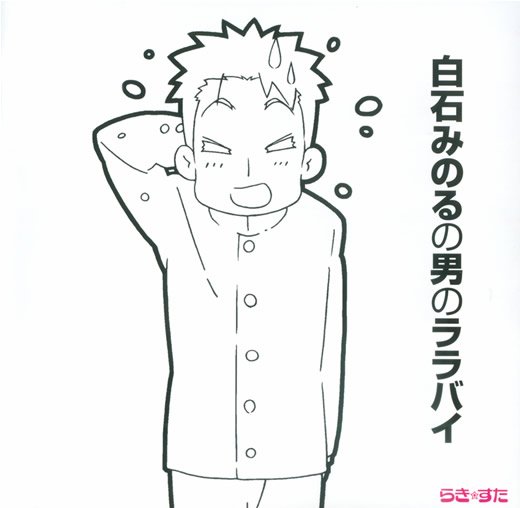 【剧情介绍】 故事描述普通的女高中生泉此方与孪生姐妹柊小司、柊小镜所发生的琐事,主角泉此方是 LOLI中少有的OTAKU,喜欢玩GAL游戏(也就是所谓的美少女游戏)以及各种电玩,平时在学习之余去COSPLAY打工等,而双胞胎姐妹中的妹妹小司平时总是戴歪头上蝴蝶结,一副很迷糊的样子,姐姐则是强气总喜欢和此方斗气的女生。 【专辑介绍】 TVアニメ「らき☆すた」後半エンディングテーマ集 - 白石みのるの男のララバイ http://www.neowing.co.jp/pictures/s/03/14/LACA-5696.jpg 商品番号: LACA-5696 メディア: CD 組枚数: 1 発売日: 2007/10/10 価格: 2400円(税込) 【Artist&Cast】 白石みのる(白石稔) (アーティスト)  内容 TVアニメ「らき☆すた」2クール目のエンディングテーマがCDに! 白石稔が作詞・作曲した珠玉の楽曲たち。2クール目のエンディングを見て、良い意味でも悪い意味でも、一瞬でも興味を引かれてしまった人なら、必ず買い!! ジャケットは描き下ろし。 【收录曲目】 01. 俺の忘れ物(13話エンディング) 02. ハレ晴レユカイ(14話エンディング) 03. 恋のミノル伝説(15話エンディング) 04. もってけ!セーラーふく(曖昧サンシャインver.)(17話エンディング) 05. かおりんのテーマ(18話エンディング) 06. 男の生き様(19話エンディング) 07. お婿ルンバ(20話エンディング) 08. シカイダーの唄(21話エンディング) 09. 白石メドレー(22話エンディング) 10. ミクル変身!そして戦闘!(23話エンディング) 11. 愛はブーメラン(24話エンディング) 12. 俺の忘れ物-完全版- 13. シカイダーの唄-完全版- 14. かおりんのテーマ-完全版- 15. 恋のミノル伝説-完全版- 16. 我が愛しのサンタモニカ-スタジオ録音版- 17. 恋したっていいじゃない-スタジオ録音版- 18. お婿ルンバ-スタジオ録音版- 19. 男の生き様-スタジオ録音版- 20. 白石みのる~奥さんシリーズ~