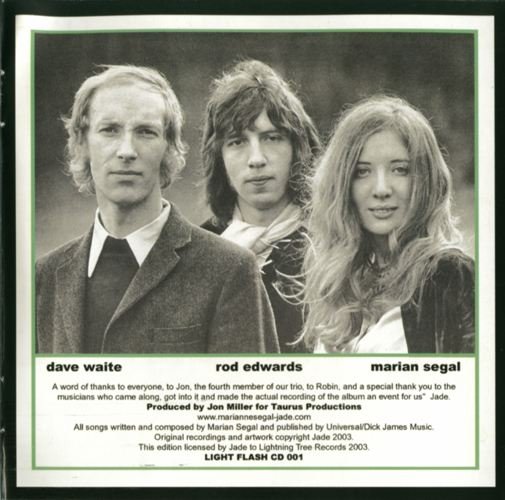 The British folk-rock trio Jade made one obscure album in 1970, Fly on Strangewings, that might have sounded closer to 1968-1969-era Fairport Convention than any other record not by Fairport themselves. Jade's lead singer, Marian Segal (who also played acoustic guitar), had a very similar voice and style to that of Fairport's woman singer of the late '60s, Sandy Denny. Too, Jade blended parts of modern folk-rock and traditional British folk in their songs, vocal harmonies, and arrangements. Jade were not as big on traditional British folk as Fairport were by late 1969, however, recalling the Fairport albums What We Did on Our Holidays and Unhalfbricking far more than the later 1969 Fairport record that took a more traditional direction in repertoire, Liege & Lief. Jade were also a wee bit more pop in their songwriting and arrangements (which occasionally used orchestration) than Fairport, their inevitable point of comparison. While Fly on Strangewings isn't as strong or original as Fairport Convention's early albums, it can be heartily recommended to anyone who loves the sound of early Fairport with Sandy Denny on vocals, and wants something in a very similar style.Jade's Marian Segal had been in a school band with future Fleetwood Mac guitarist Danny Kirwan, and began singing in London folk clubs around 1966. In 1967 she formed a duo with singer, fellow acoustic guitarist, and banjo player Dave Waite; he'd formerly been in the folk group the Countrymen, who had a minor British hit single in 1962 with "I Know Where I'm Going." By the end of the 1960s they'd moved away from traditional folk to contemporary material and original songs, and were managed by Jon Miller, who was in partnership with famous British music publisher Dick James. They got a deal with James' DJM label and Miller, who'd produce Jade's album, introduced them to singer and keyboardist Rod Edwards, who became the third member of the band. Moving to a more rock-oriented sound, the album benefited from session work by several noted musicians of the time, including Michael Rosen (who'd been in the underrated British folk-rock group Eclection), Pete York (of the Spencer Davis Group and Hardin & York), Terry Cox (of the Pentangle), Pete Sears (later of Jefferson Starship), top U.K. session drummer Clem Cattini, and Mick Waller (who played with Jeff Beck and Rod Stewart during that period).While their debut album had come out in the U.K. in mid-1970 under the name Jade, there was another group of that name in the U.S., so the album was billed to Marian Segal With Silver Jade when it was issued by Bell in America in mid-1971. The group toured the States in the summer of 1971, but split up that autumn, by which time Segal was working on an unfinished solo album. Segal and Waite continued playing as the Marian Segal Band with other musicians for a few years, but didn't get a recording deal before they split up in the mid-'70s. Fly on Strangewings was reissued on CD in 2003, with both sides of an unreleased 1971 single (on which John Wetton plays bass) added as bonus tracks.