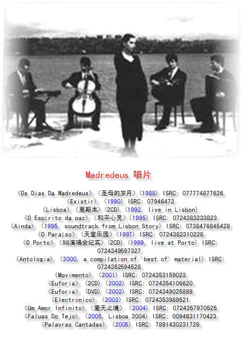 Madredeus(圣母合唱团)是一个葡萄牙乐团,创立于1985年,1988年开始巡回演唱至今,乐团已走遍世界各地,带着无数的回忆和情感,成为葡萄牙的第一个国际音乐大使。全球演唱会的卖座情形以及世界多国超过300万张的唱片销售量,证明着这个乐团的成功。他们的音乐平和,安静但又充满热情,让你畅想人生,是个不可多得的人文乐队。