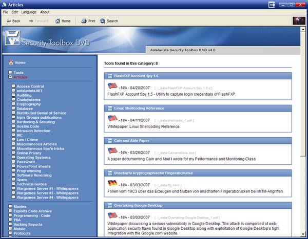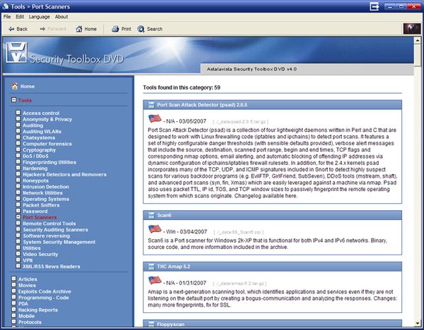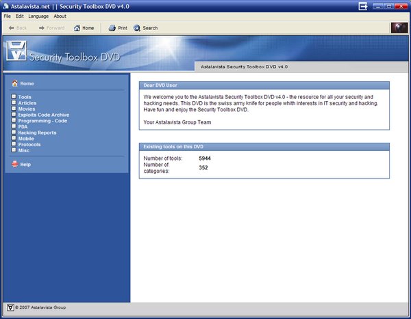 Astalavista's Security Toolbox DVD v4.0 is considered to be the largest and most comprehensive Information Security archive. As always we are committed to provide you with a resource for all of your security and hacking interests, in an interactive way! The Information found on the Security Toolbox DVD has been carefully selected, so that you will only browse through quality information and tools. No matter if you are a computer enthusiast, a computer geek, a newbie looking for information on "how to hack", or an IT Security professional looking for quality and up to date information for offline use or just for convenience, we are sure that you will be satisfied, even delighted by the DVD!