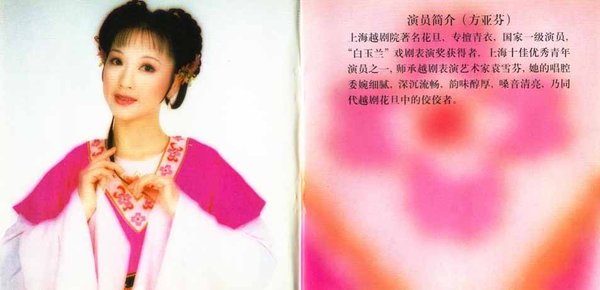 方亚芬芳,上海越剧院著名花旦,专擅青衣,国家一级演员,“白玉兰”戏剧表演奖获得者,上海十佳优秀青年演员之一,师承越剧表演艺术家袁雪芬,她的唱腔委婉细腻,深沉流畅,韵味醇厚,嗓音清亮,乃同代越剧花旦中的佼佼者。