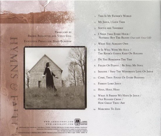 : 01. This Is My Father's World (Traditional) 02. My Jesus, I Love Thee (Traditional) 03. Softly and Tenderly (Traditional) 04. I Need Thee Every Hour/Nothing but the... performed by Grant / Vince Gill 05. What You Already Own (Grant) 06. It Is Well With My Soul/The River's Gonna... (Gill/Public Domain) 07. Do You Remember the Time (Gill/Grant/Thomas) 08. Fields of Plenty/Be Still My Soul (Bennett/Public Domain) 09. Imagine/Sing the Wondrous Love of Jesus (Grant/Millard) 10. Come, Thou Fount of Every Blessing (Public Domain) 11. Fairest Lord Jesus (Public Domain) 12. Holy, Holy, Holy (Public Domain) 13. What a Friend We Have in Jesus/Old Rugged... (Hine/Public Domain) 14. Marching to Zion (Public Domain)