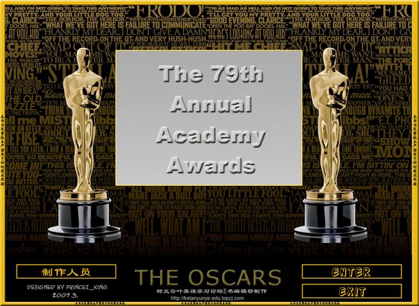 英文名称:The 79th Annual Academy Awards 中文名称:第79届OSCAR颁奖典礼精华 视频制作:kelanyunye 文本校对:JOJO pinnacle and kelanyunye 文本翻译:ouyangfeng juventus melody Sonic kelanyunye 界面设计&程序编写:princeI_king 软件格式:EXE 软件容量:89M 界面规格:1024*748象素 视频格式:wmv 视频规格:639*423象素 视频字幕:中英双语 软件内容:精选第79届OSCAR颁奖典礼精华,包括:1.最佳影片---The Departed 2.最佳女配角---Dream Girls 3.最佳男配角---Little Miss Sunshine 4.最佳女主角---The Queen 5.最佳男主角---The Last King of Scotland 6.最佳导演---Martin Scorsese(The Departed) 背景音乐/歌曲:《Our Town》, 《An Inconvenient Truth》, 以及Ennio Morricone创作的电影配乐,包括:《Days of Heaven》, 《The Mission》, 《Investigation of A Citizen Above Suspicion》, 《Bugsy》, 《Malena》, 《The Untouchables》 杀毒软件: Kaspersky 6.0每日更新病毒库 常在服务器: DonkeyServer No1 供源时间: 晚7:00--10:00,平时有空会尽量上线供源