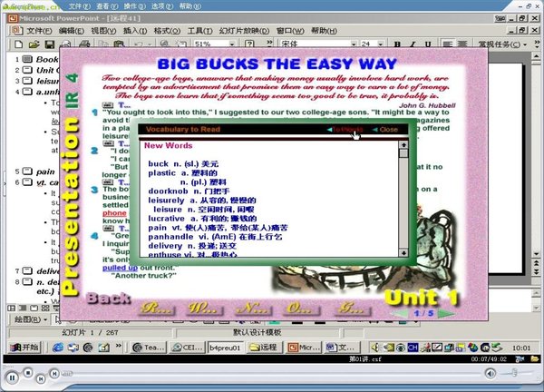 教材 《大学英语》(修订本)精读,上海外语教育出版社。 格式:CSF 单独的CSF文件(第1-67讲CSF文件)为1册内容,压缩文件和ISO文件中没有1册的内容。 1,2,3,4册更新完毕。[/COLOR。 我首先替那些下载的朋友对提供分流的朋友说一声谢谢。 使用中如果出现"提示文件不存在或文件格式错误",请下载最新的播放器,地址www.colleagesoft.com.cn,或者下载最新插件,地址:http://218.94.36.162/detail.aspx?id=121 4册最后一个文件已经修正,如果你下了100多M后出现无法下载,必须删除已经下载的文件,重新通过本页的联结下载--------简单的说,最后一个文件的联结地址变化了. 只是期盼更多的人愿意做种,这样我可以腾出硬盘空间,提供其它课程。 现在股票和基金很热,求上海交大和哈工大的证券类远程教育课程 网友评价: 一个课件的优劣主要在教师身上,所以我说说这门课的教师马俊.首先她适合教语言.因为她思维清晰,说话连贯,语速适中.英语发音标准.语言能力强,一些英语表达方式能被她找到汉语中意思相同或相近的大白话.既有趣有便于理解.. 其次,词汇量大,每当教到一个重要词汇时便会列出一大串相关词汇,以便一起记忆.不仅就词论词,还教行之有效的记忆方法,如第一课panhandle这个词是平底锅把手,想象成在路边拿着锅子乞讨,就能记住乞讨之意.又如derive这个词,看到rive自然会想到河(river),这个词的愿意是从河里取水,所以是来源,起源的意思.还有,教学方法得当,在翻译句子时她通常先一个个单词或词组地翻,然后直译,最后才说比较正规的书面化的翻译,这符合常人的思维过程.在讲课后习题时,她会旁敲侧击地启发你思考,然后才给出答案,同时对习题中有用的单词和表达法都做了总结.教学形式就是传统课堂的教学形式,先讲单词,再讲课文,最后是练习.教师的PPT会给出每个单词的中英文双解,配合大量例句和习惯搭配.分析课文是一句一句地看过去,着重分析长句难句的结构.同时还分析文章的篇章结构.另外除了教材的教学内容,上课时还有一些富有哲理的英语短文或脑筋急转晚之类的题目,调剂一下气氛。 每个人都有自己的口味,所谓众口难调,我认为这个课件不错,但对于其他人就有可能是垃圾.所以有朋友看过后不如意的话可不要骂我 如果有下完的,很希望有人愿意重新做种,如果有人愿意这样做,我将陆续提供其他课程,512K的ADSL,上传多在40K以上。我上网只能晚上,很不方便。 声明:只用于测试之用,如果您喜欢请支持和购买正版! 杀毒软件和版本:金山毒霸2007 病毒库:更新到2006年12月26日 常驻:DonkeyServer系列(有时不定) 在线时间:在线时间:晚上7:00-早7:00 资料共享时间: 在线时间:晚上7:00-早7:00 本资料经金山毒霸2007查杀无毒