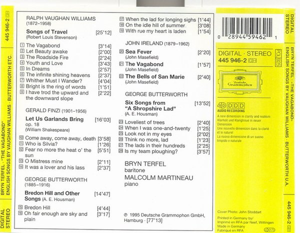 : 1. Songs Of Travel: The Vagabond 2. Songs Of Travel: Let Beauty Awake 3. Songs Of Travel: The Roadside Fire 4. Songs Of Travel: Youth And Love 5. Songs Of Travel: In Dreams 6. Songs Of Travel: The Infiinite Shining Heavens 7. Songs Of Travel: Whither Must I Wander? 8. Songs Of Travel: Bright Is The Ring Of Words 9. Songs Of Travel: I Have Trod The Upward And The Downward Slope 10. Let Us Garlands Bring, Op. 18: Come Away, Come Away, Death 11. Let Us Garlands Bring, Op. 18: Who Is Silvia? 12. Let Us Garlands Bring, Op. 18: Fear No More The Heat O' The Sun 13. Let Us Garlands Bring, Op. 18: O Mistress Mine 14. Let Us Garlands Bring, Op. 18: It Was A Lover And His Lass 15. Bredon Hill And Other Songs: Bredon Hill 16. Bredon Hill And Other Songs: Oh Fair Enough Are Sky And Plain 17. Bredon Hill And Other Songs: When The Lad For Longing Sighs 18. Bredon Hill And Other Songs: On The Idle Hill Of Summer 19. Bredon Hill And Other Songs: With Rue My Heart Is Laden 20. Sea Fever 21. The Vagabond 22. The Bells Of San Marie 23. Six Songs From 'A Shropshire Lad': Loveliest Of Trees 24. Six Songs From 'A Shroshire Lad': When I Was One-And-Twenty 25. Six Songs From 'A Shropshire Lad': Look Not In My Eyes 26. Six Songs From 'A Shropshire Lad': Think No More, Lad 27. Six Songs From 'A Shropshire Lad': The Lads In Their Hundreds 28. Six Songs From 'A Shropshire Lad': Is My Team Ploughing?